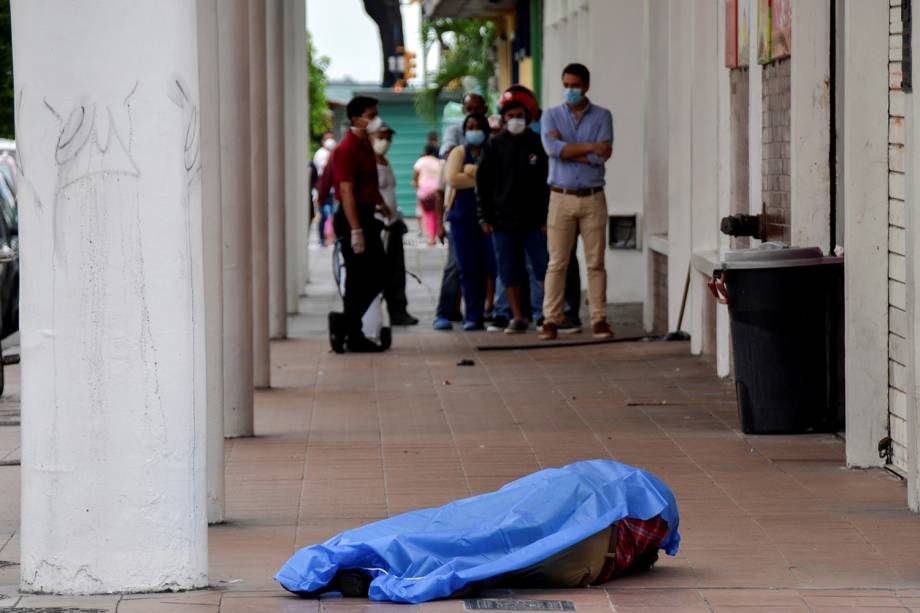 Pessoas ficam na fila em frente a uma loja perto do cadáver de um homem que desmaiou na calçada, durante o surto de coronavírus, em Guayaquil, no Equador -Vicente Gaibor del Pino/Reuters