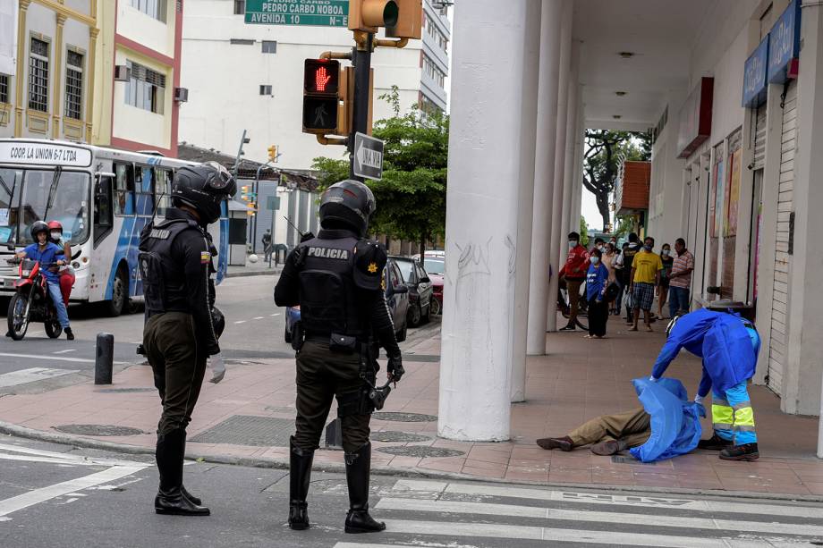 Um paramédico cobre o corpo de um homem que morreu após desmaiar na calçada, durante o surto do coronavírus, em Guayaquil, no Equador – Vicente Gaibor del Pino/Reuters