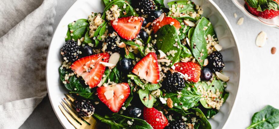 Super saudável e leve, essa é uma salada perfeita de primavera e verão recheada com morangos frescos, mirtilos e amoras com um delicioso molho de laranja! Receita de Simple Veganista. Tempo: 30 minutos Rendimento: Serve 4 INGREDIENTES 1 xícara de quinoa seca, lavada 1 3/4 xícara de água 140 gramas de espinafre (cerca de 5 xícaras ) 1 xícara de mirtilosContinue Reading
